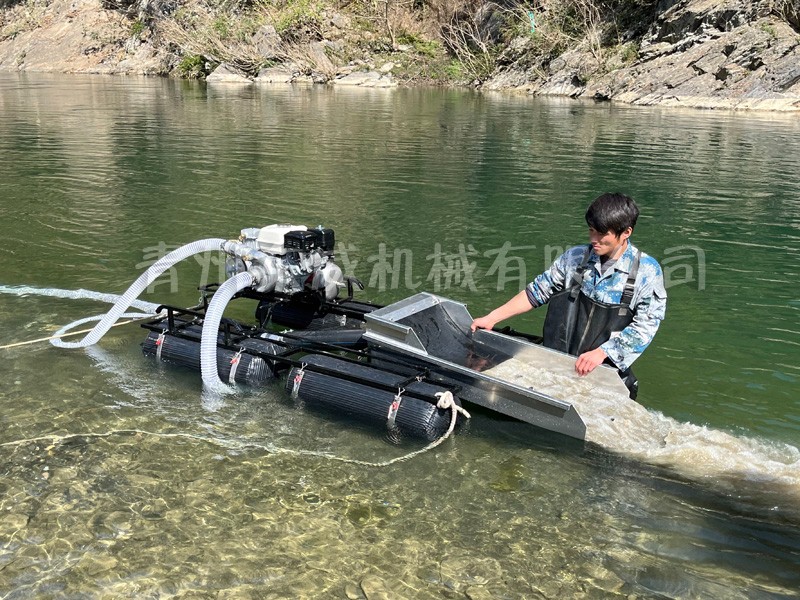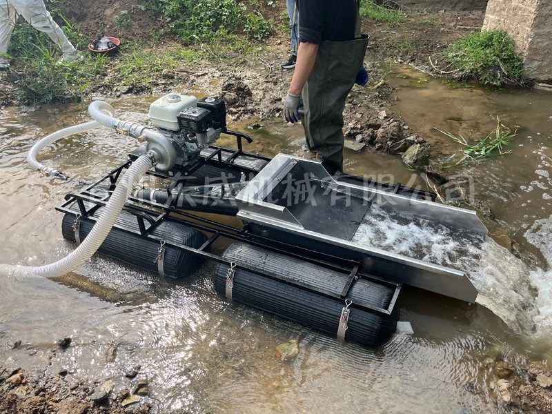 虹吸式淘金船是由机器、高压水泵、浮体、射流嘴、管路、选矿溜槽等构成,具有体积小、轻量化、便于拆装运输等特点,是沙金采选行业内投资少、见效快的新选择;可选装空压机系统,潜入水下进行探矿、选矿操作。