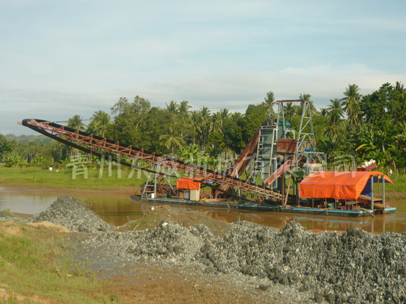 淘金船是一种集采矿作业、选矿作业为一体的水上联合工厂,是一种砂金、铁粉、锡矿、钨矿等重金属开采设备,它包括链斗挖掘系统、选矿及供水系统、废矿及尾矿排弃系统、甲板机械、船体、上部钢构、供电等几个基本系统。