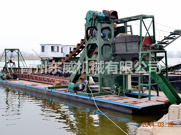 链斗式挖沙船可根据客户性能要求及工矿作业特点设计制造。物料挖掘出来并由输送机或输送泵输送至岸边、运沙船的功能;浮体采用横骨架式分体箱形结构,转运时可拆装后装车。装有定位设备、链斗挖掘装置、桥架升降装置及皮带输送机等。水下杆是由安装在浮体上的绞车实现升降,砂石料通过链斗装置挖掘上来,由输送机或输送泵输送到岸上或运沙船。